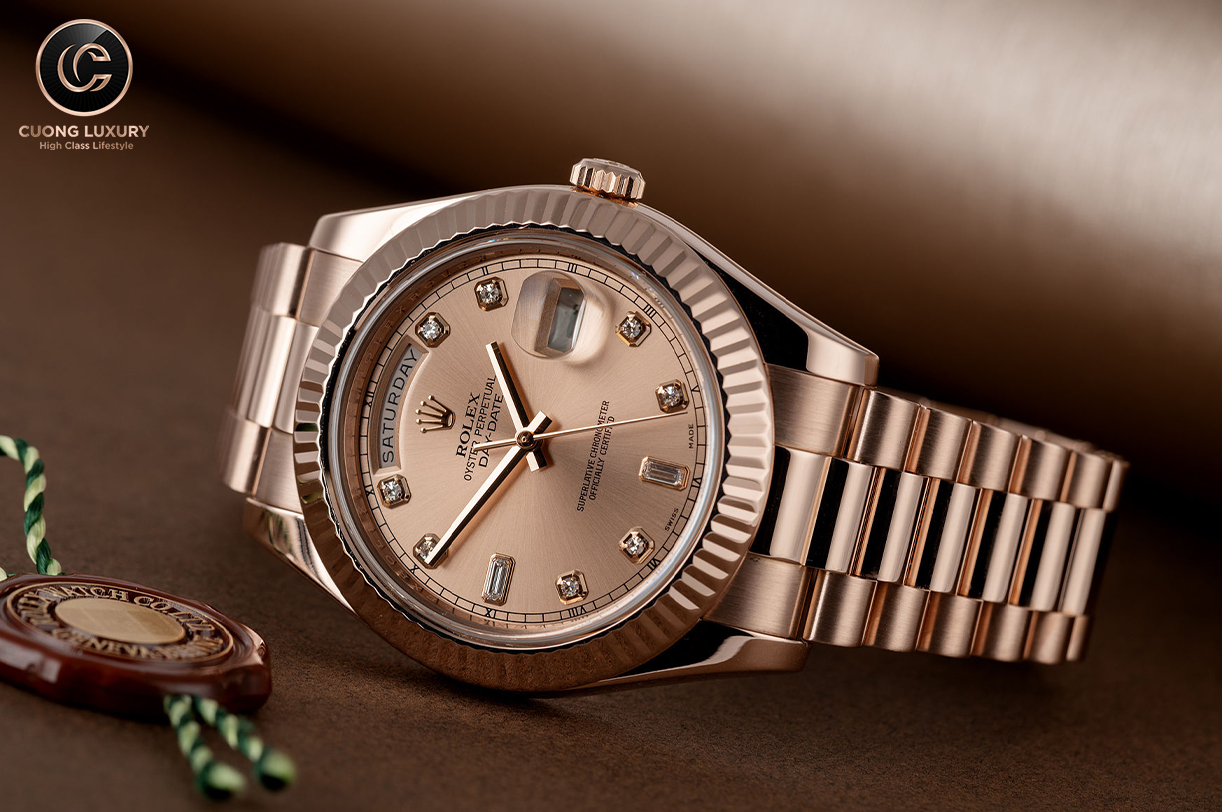 Rolex là một thương hiệu đặc biệt với nhiều dòng đồng hồ xa xỉ mang tính biểu tượng, tuy nhiên, dòng Day-Date vẫn được đánh giá là ấn tượng và dễ nhận biết nhất. Mẫu đồng hồ sở hữu thiết kế dáng vỏ sò Oyster tròn cổ điển cùng vành bezel cắt rãnh vô cùng nổi bật. Trên mặt số, Day-Date như tên gọi của mình có khả năng hiển thị thời gian bao gồm thứ và ngày.