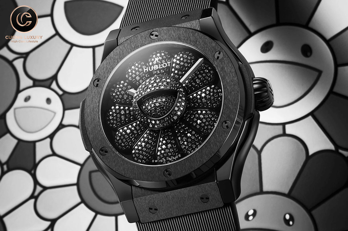 Mẫu Hublot Classic Fusion Takashi Murakami All Black nổi bật với bộ vỏ được làm từ gốm đen Black Ceramic với các đường vân chải xước và đánh bóng tinh xảo. Đặc biệt hơn, mặt số của mẫu đồng hồ được trang trí bằng một “bông hoa cười” - sáng tác nghệ thuật đặc trưng của nghệ sĩ Takashi Murakami. Bông hoa cười này được trang trí với tổng cộng 456 viên kim cương đen và kèm theo đó, những cánh hoa cũng được gán cơ chế chuyển động tròn hết sức ấn tượng.