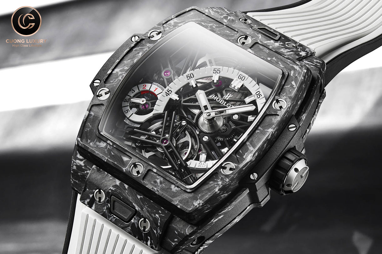 Được ra mắt với số lượng giới hạn chỉ 100 chiếc, Spirit of Big Bang Tourbillon 5-day Power Reserve Carbon White biết cách tạo nên sức hút và sự chú ý của người xem với phần mặt đồng hồ và mặt lưng trong suốt, khoe trọn cấu trúc thẩm mỹ tinh tế của bộ máy HUB 6020 với cơ chế Tourbillon lộ cơ được thiết kế đặc biệt cho bộ vỏ dáng thùng của chiếc Spirit of Big Bang.