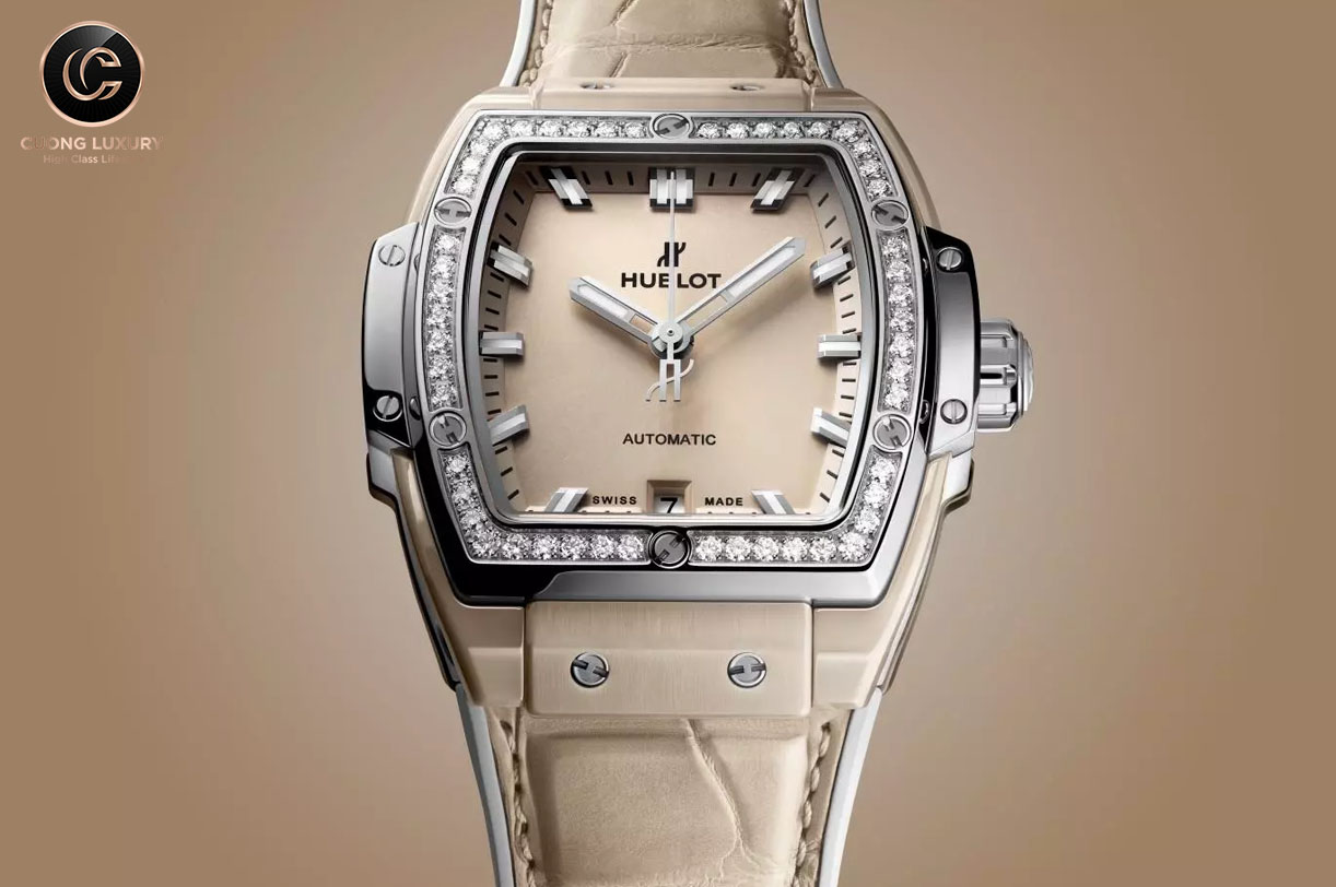 Sau phiên bản màu xanh lam và hồng pastel, Hublot phủ thêm sự nữ tính lên chiếc Spirit of Big Bang Ceramic với tông màu be (Beige) tạo thành một dải mềm mại trên cổ tay của những người phụ nữ hiện đại.