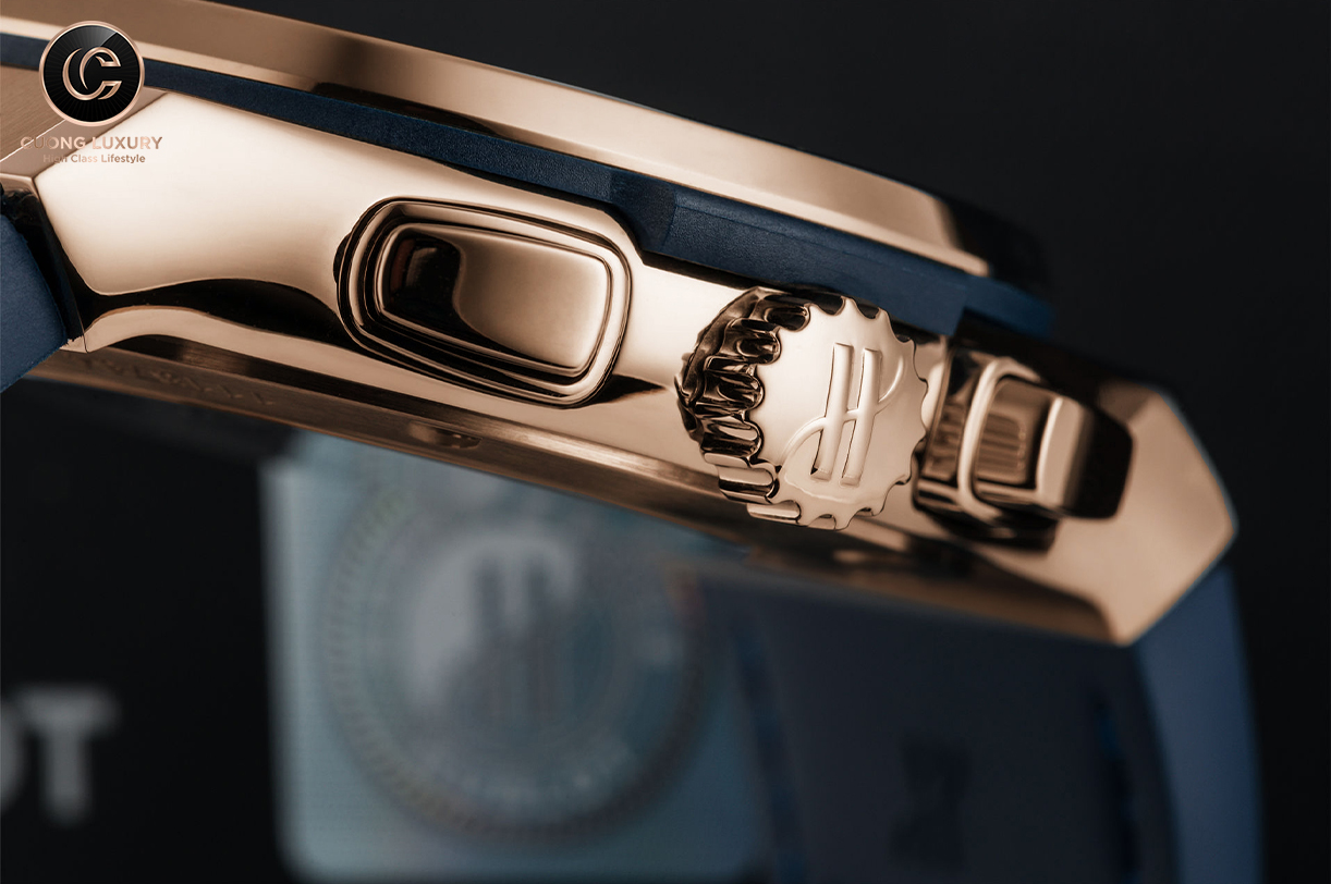 Tuy nhiên, điểm đáng chú ý ở tính năng này là Hublot đã trang bị thêm một bộ khóa giúp ngăn người dùng bấm reset khi tính năng đếm giờ đang chạy. Tính năng này rất hữu ích bởi lẽ việc can thiệp để reset bộ đếm khi nó đang chạy sẽ dẫn đến nguy cơ làm gãy các bánh răng và gây hỏng hóc bộ máy và tình trạng này rất thường gặp với những người mới dùng đồng hồ hoặc chưa nắm rõ cấu tạo và hoạt động của các bộ máy cơ học.