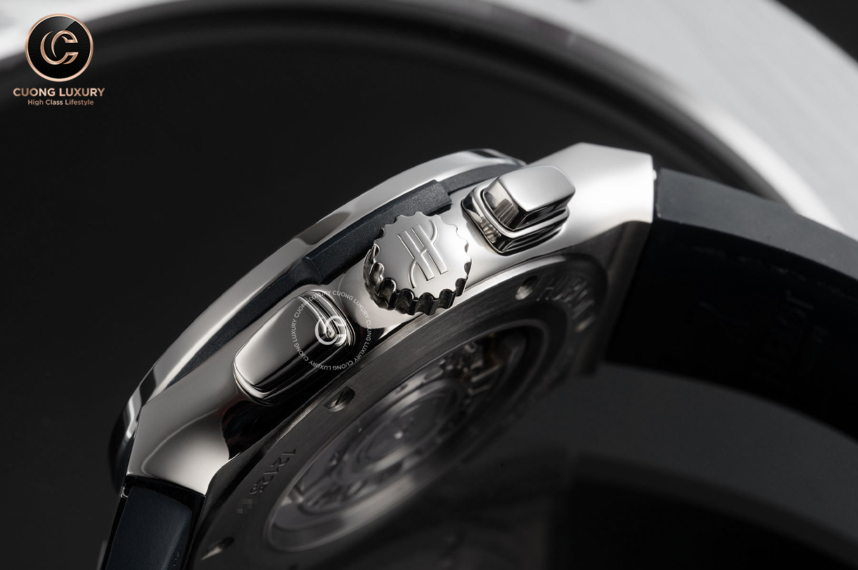 Không những thế, để minh chứng cho sự kỳ công, tỉ mỉ của nhà Hublot, các nghệ nhân đã ghi dấu ấn với cọc số hình học màu sáng bạc nổi bật. Trên nền đen huyền bí, từng dòng chữ mang thương hiệu Hublot dần được khắc họa. Và để hoàn thiện cho vẻ đẹp hoàn mỹ này, chúng ta không thể không kể đến dây đeo cao su vân da cá sấu. Đây là chất liệu cao cấp cho độ bền cực cao, đồng thời giúp người sử dụng cảm thấy thoải mái hơn khi đeo trên tay trong thời gian dài.