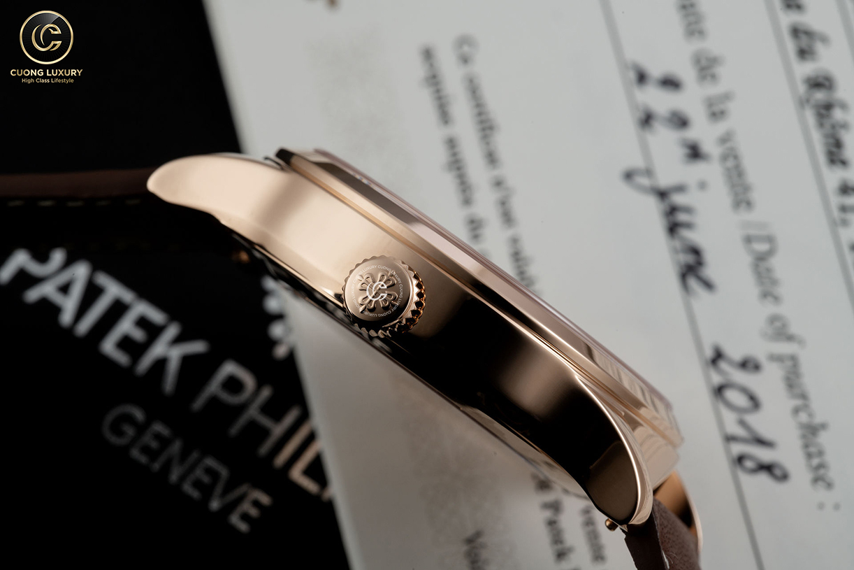 Bên cạnh đó, khung vỏ của Calatrava 5524R-001 còn được Patek Philippe đánh bóng một cách hoàn hảo trong mọi góc nhìn, từ vành bezel cho đến tai càng và cả các viền, cạnh, góc. Chúng đem đến độ sáng rực rỡ và rất bắt mắt, giúp đồng hồ thực sự toát lên được vẻ xa xỉ đặc trưng. Hai bên cạnh máy, các phím chỉnh giờ được khéo léo đặt sang bên trái giúp phân biệt mẫu đồng hồ với những phiên bản Chronograph, đồng thời đem đến cho 5524R-001 một thẩm mỹ cân đối và khác biệt.