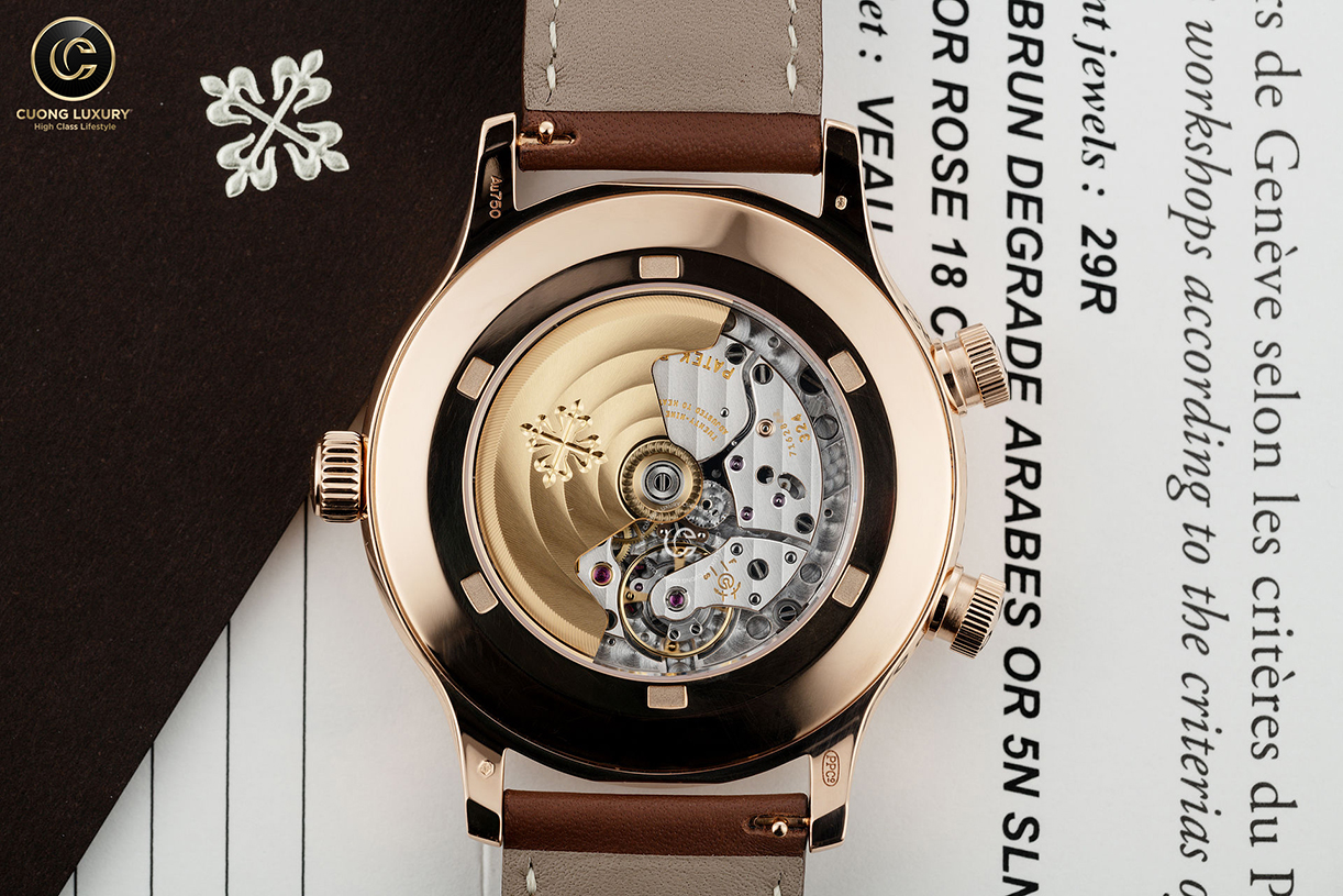 Đi sâu hơn vào bên trong đồng hồ, chúng ta sẽ được bắt gặp cỗ máy Calibre 324 SC FUS - một bộ máy hoàn hảo của Patek Philippe với khả năng vận hành cực kỳ bền bỉ và chính xác. Bộ máy này được hoàn thiện với 294 thành phần, 29 chân kính, hoạt động ở tần số 28.800vph, và cho khả năng trữ cót tối đa trong khoảng 45 giờ.