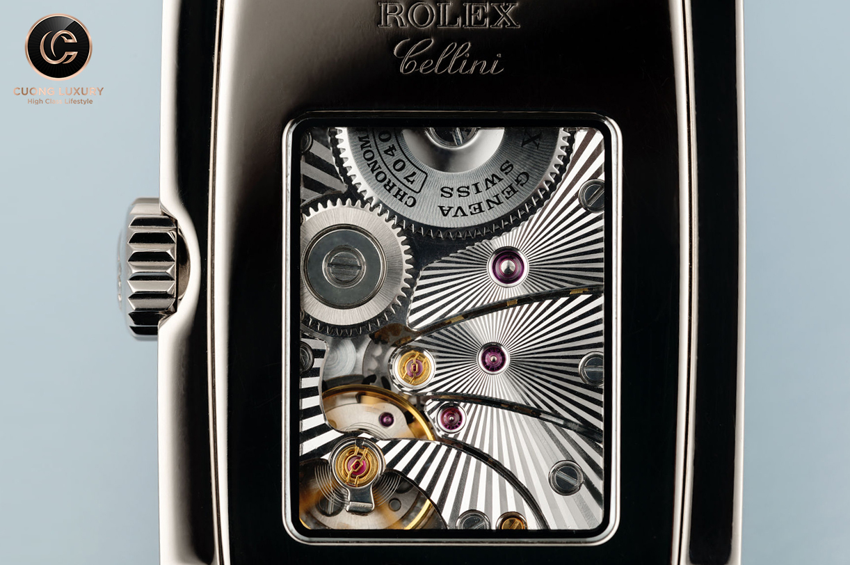 Quay trở lại với điểm độc đáo nhất trên dòng Rolex này, Cellini Prince được thiết kế với phần kính Sapphire tại mặt lưng giúp khoe trọn các chi tiết của bộ máy bên trong đồng hồ, một điều chưa từng xảy ra với bất kì dòng đồng hồ nào khác của thương hiệu. Bộ máy bên trong mẫu đồng hồ cũng thuộc dạng đặc thù bởi nó có hình chữ nhật giống với bộ vỏ, được hoàn thiện một cách rất tỉ mỉ với tên gọi là Rolex calibre 7040. Bộ chuyển động này có thiết kế tương đối đơn giản nhưng vẫn sở hữu đến 21 chân kính, với khả năng dự trữ cót tối đa lên đến 72 giờ, cũng như kháng nước đạt 50m và đặc biệt, nó cũng được cấp chứng chỉ COSC về khả năng hoạt động của đồng hồ.